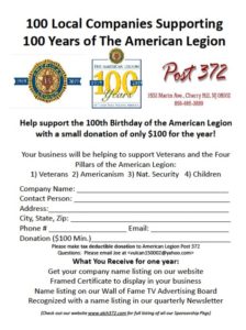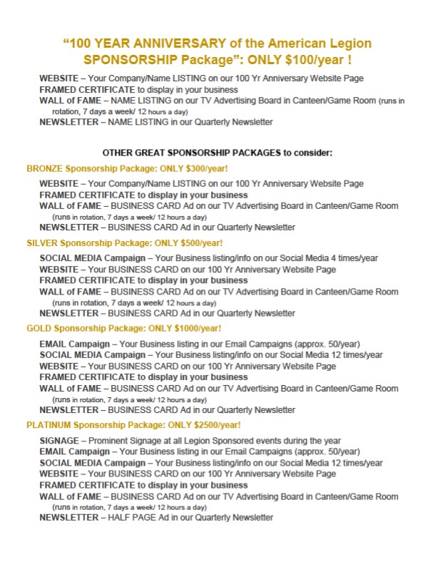 “100 YEAR ANNIVERSARY of the American Legion SPONSORSHIP Package”: ONLY $100/year !