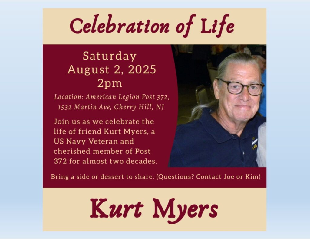 Saturday, August 2nd at 2pm. Join us as we celebrate the life of friend Kurt Myers, a US Navy Veteran and cherished member of Post 372 for almost two decades. Bring a side dish to share. Any questions, contact Kim or Joe