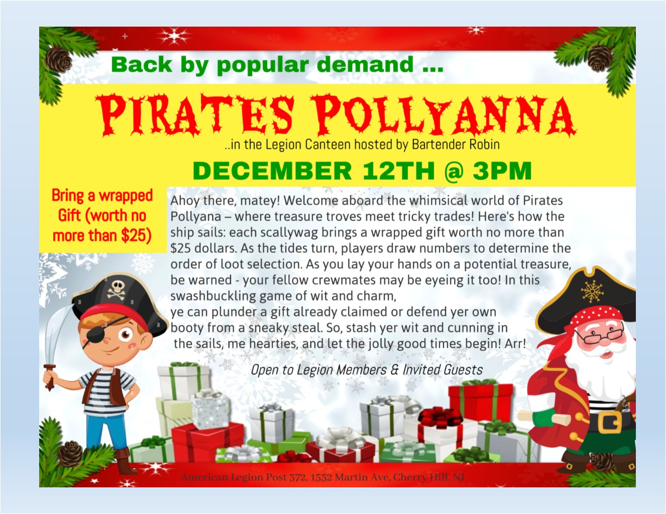 December 12, 2025 at 3pm in Legion Canteen. Bring a wrapped Gift (worth no more than $25). Ahoy there, matey! Welcome aboard the whimsical world of Pirates Pollyana – where treasure troves meet tricky trades! Here's how the ship sails: each scallywag brings a wrapped gift worth no more than $25 dollars. As the tides turn, players draw numbers to determine the order of loot selection. As you lay your hands on a potential treasure, be warned - your fellow crewmates may be eyeing it too! In this swashbuckling game of wit and charm,ye can plunder a gift already claimed or defend yer own booty from a sneaky steal. So, stash yer wit and cunning in the sails, me hearties, and let the jolly good times begin! Arr!