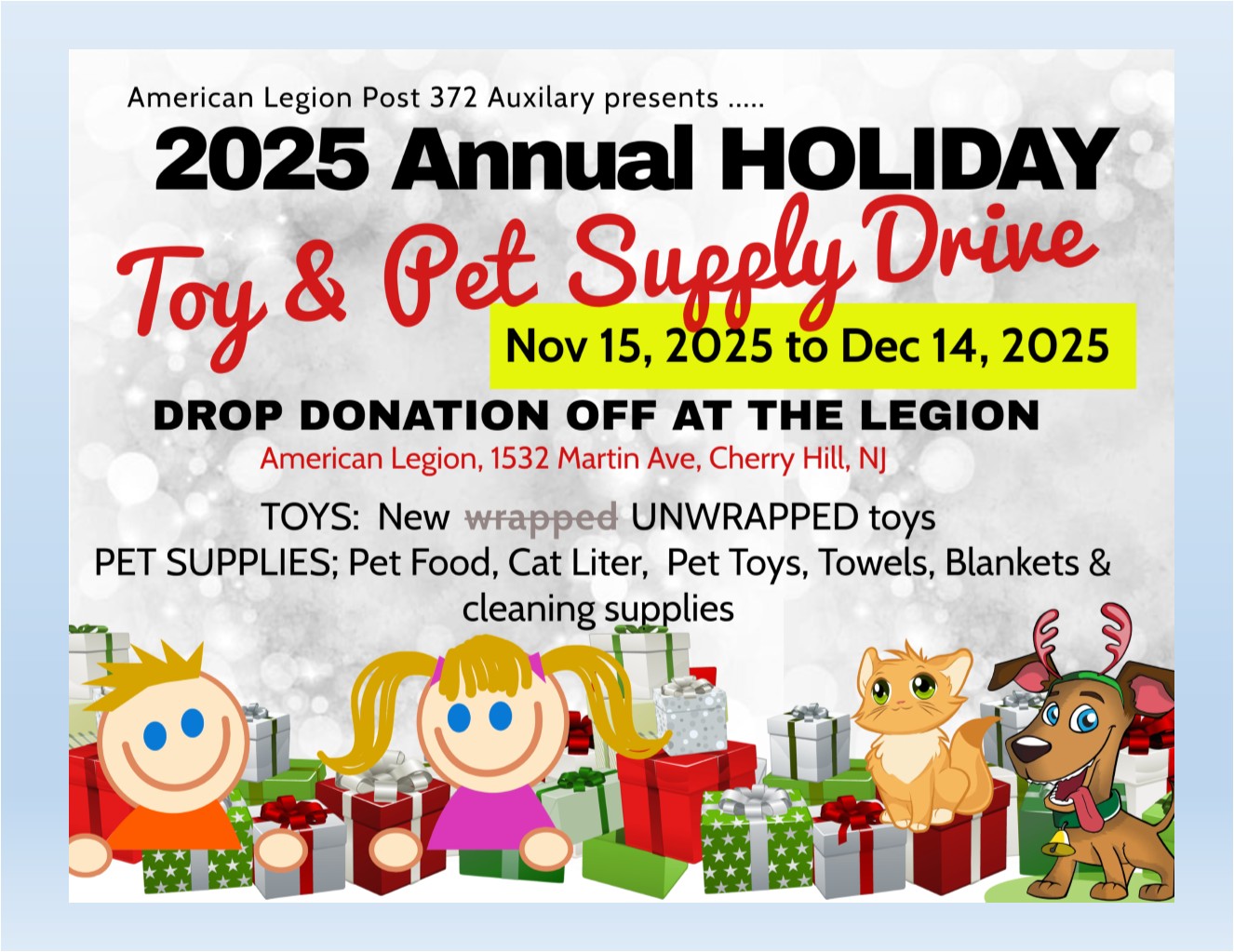 CHANGE in TOY & PET DRIVE - Please bring UNWRAPPED toys (not wrapped ones as previously asked for)