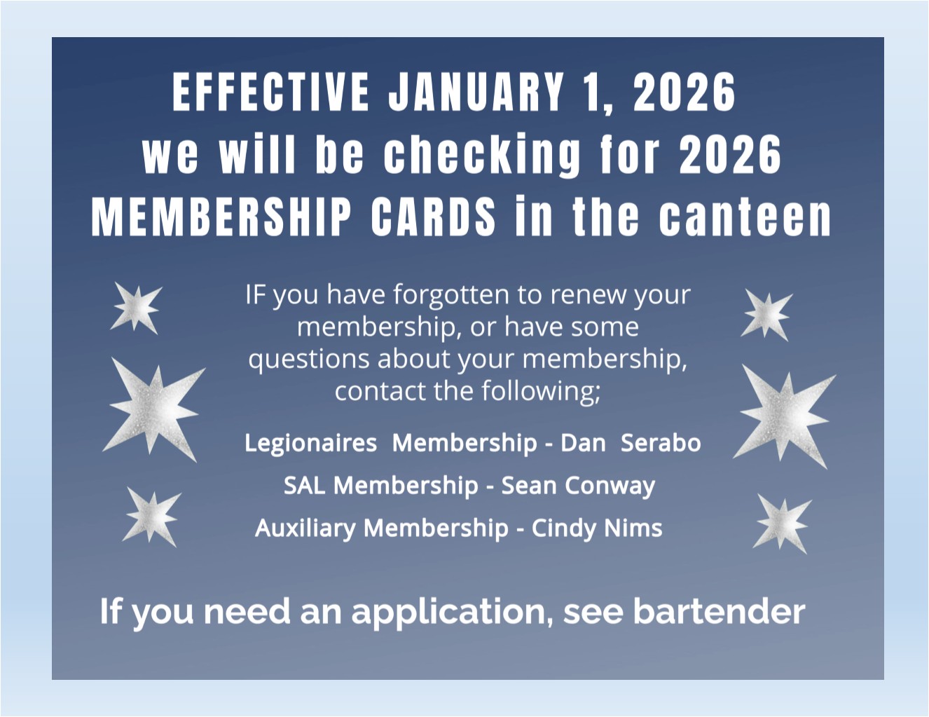 Effective January 1, 2026, membership cards will be checked when coming in the canteen. If you have forgotten to renew your membership, please contact you unit membership chairperson. Click here for contact information for Membership Chairpeople.