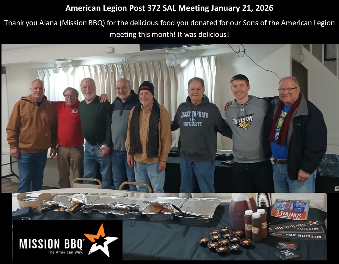 SAL Officers Thank Mission BBQ for Food American Legion Cherry Hill NJ Post 372 Posted on January 21, 2026 by Sue Quinn-MorrisJanuary 21, 2026 SAL Meeting - January 21st - Thank you Alana (Mission BBQ) for the delicious food you donated for our Sons of American Legion meeting this month. It was delicious!