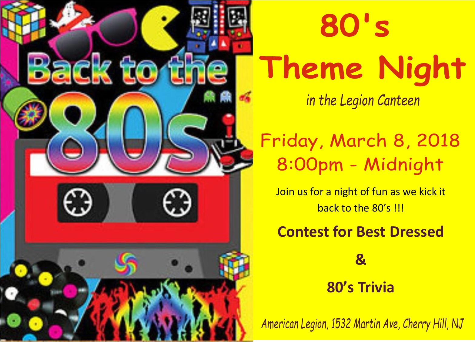 80’s Night in the Canteen American Legion Cherry Hill NJ Post 372 Posted on March 8, 2019 by March 1, 2019 When March 8, 2019 8:00 pm - 11:59 pm Add To Calendar Download ICS Google Calendar iCalendar Office 365 Outlook Live Where American Legion Post 372 1532 Martin Ave, Cherry Hill, NJ, 08002 Join us for a night of fun as we kick it back to the 80’s !!! Contest for Best Dressed & 80’s Trivia