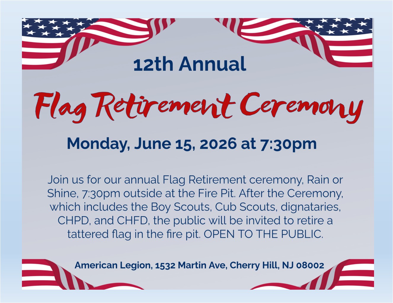 Join us for our annual Flag Retirement ceremony, Rain or Shine, 7:30pm outside at the Fire Pit. After the Ceremony, which includes the Boy Scouts, Cub Scouts, dignataries, CHPD, and CHFD, the public will be invited to retire a tattered flag in the fire pit. OPEN TO THE PUBLIC