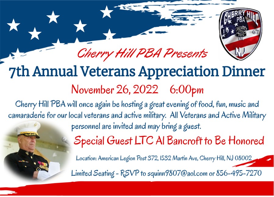 On November 26, 2022, the Cherry Hill PBA will once again be hosting a VETERANS APPRECIATION DINNER at the American Legion Post 372. In addition to providing an evening with great food, music and camaraderie, they will be honoring our beloved Post 372 member, Lt Col Al Bancroft, for his service to our country and his recent retirement from the Camden County Veterans Affairs Office. (Jan 2022). All military/veterans are invited and may bring a guest. RSVPs are required as there is limited seating. RSVP to squinn9807@aol.com or 856-495-7270 by Nov 15th.