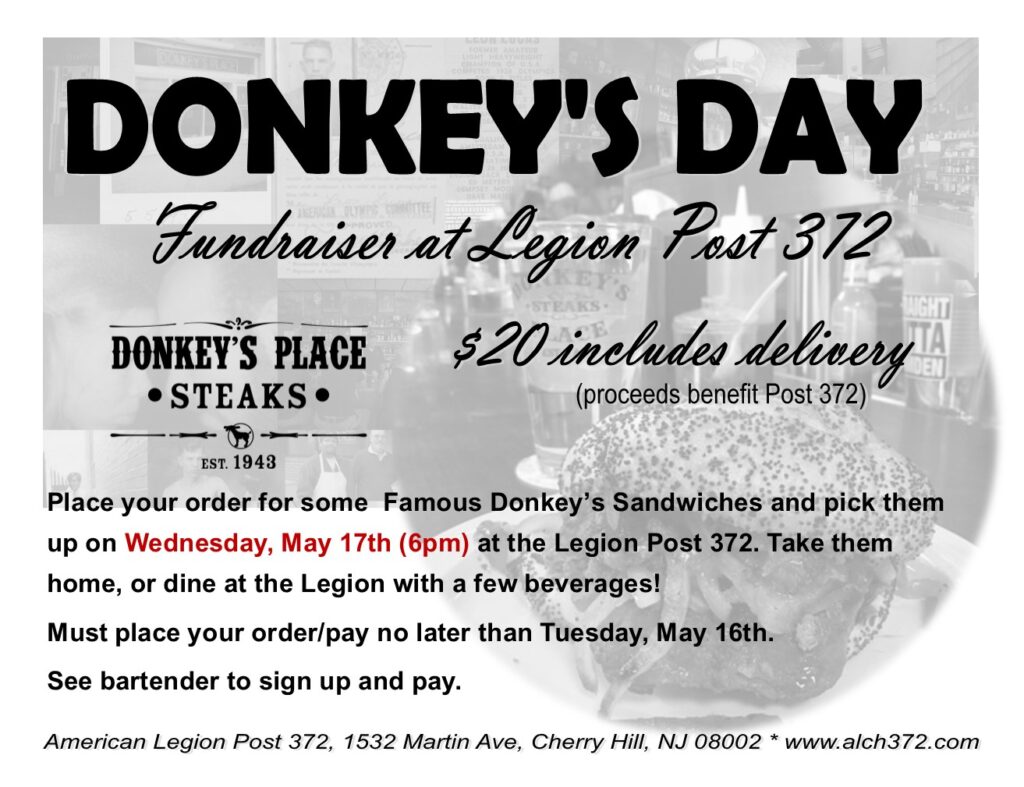 Place your order for some Famous Donkey’s Sandwiches and pick them up on Wednesday, May 17 (6pm) at the Legion Post 372. Take them home, or dine at the Legion with a few beverages! Must place your order/pay no later than Tuesday, May 16. See bartender to sign up and pay.