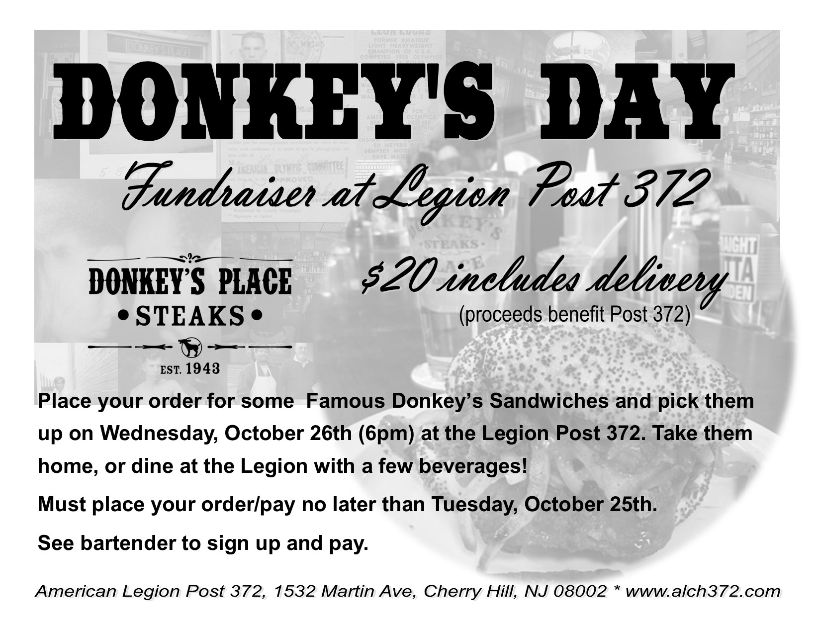 Place your order for some  Famous Donkey’s Sandwiches and pick them up on Wednesday, October 26th (6pm) at the Legion Post 372. Take them home, or dine at the Legion with a few beverages!