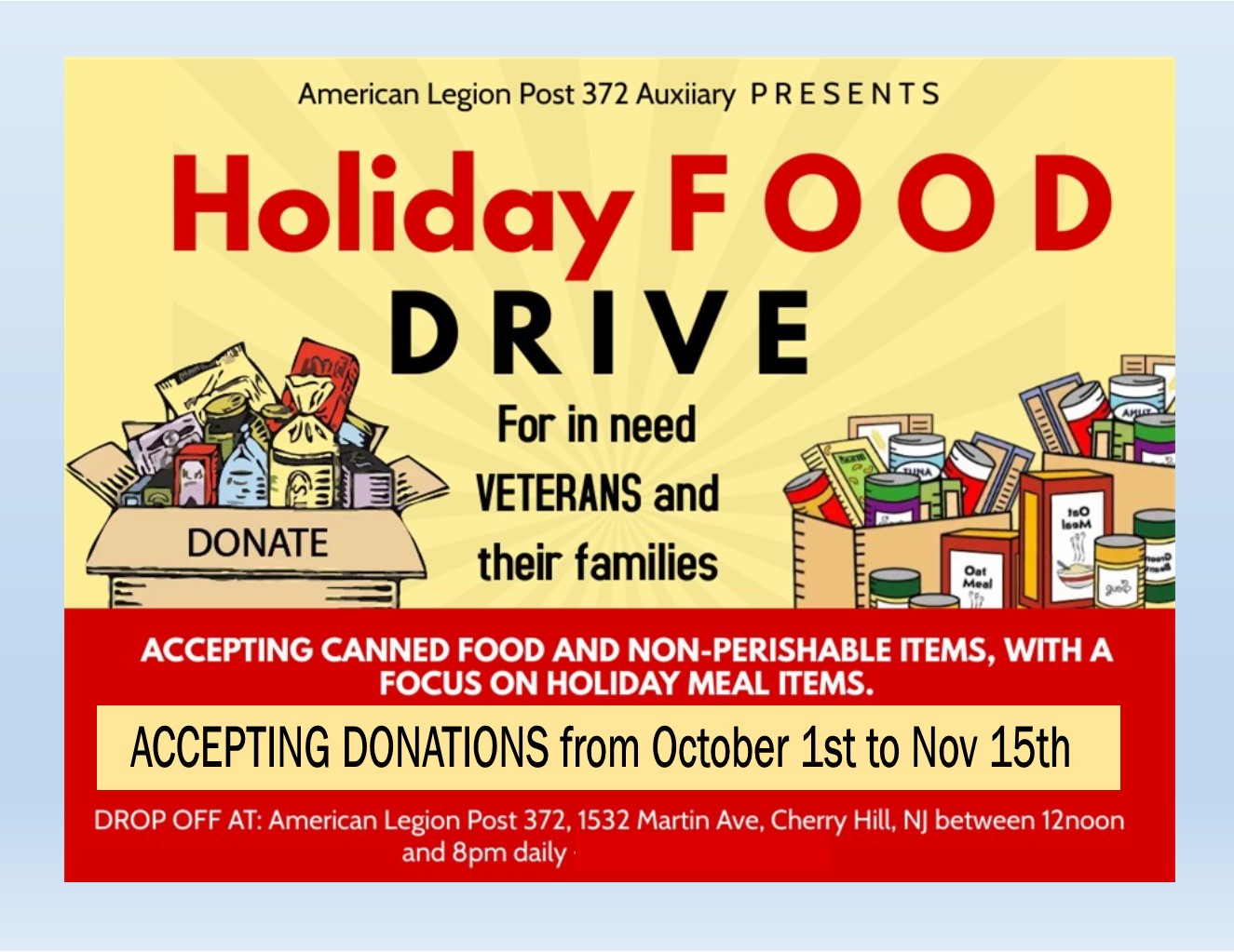 Get ready to spread some holiday cheer because the Auxiliary is gearing up for its annual HOLIDAY Food Drive to support veterans and their families in need. Let’s come together to make a difference by donating canned goods and non-perishable items, especially those perfect for holiday meals. Whether it’s cranberry sauce, stuffing mix, or hearty soups, every contribution counts! Drop off your donations at the canteen from October 1st to November 15th and let’s make this holiday season a little brighter for those who have served our country. Your generosity is truly heartwarming!