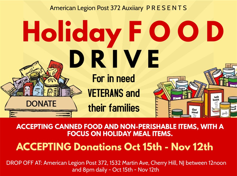 Holiday Food Drive American Legion Cherry Hill NJ Post 372 Posted on October 15, 2022 by October 3, 2022 When October 15, 2022 - November 12, 2022 All Day Add To Calendar Download ICS Google Calendar iCalendar Office 365 Outlook Live Where American Legion Post 372 1532 Martin Ave, Cherry Hill, NJ, 08002 For in need veterans and their families. Accepting canned food, non-perishable items, with a focus on holiday meals. Accepting donations from October 15th through November 12th, 2022. Drop off at the Legion canteen between 12noon – 8pm.