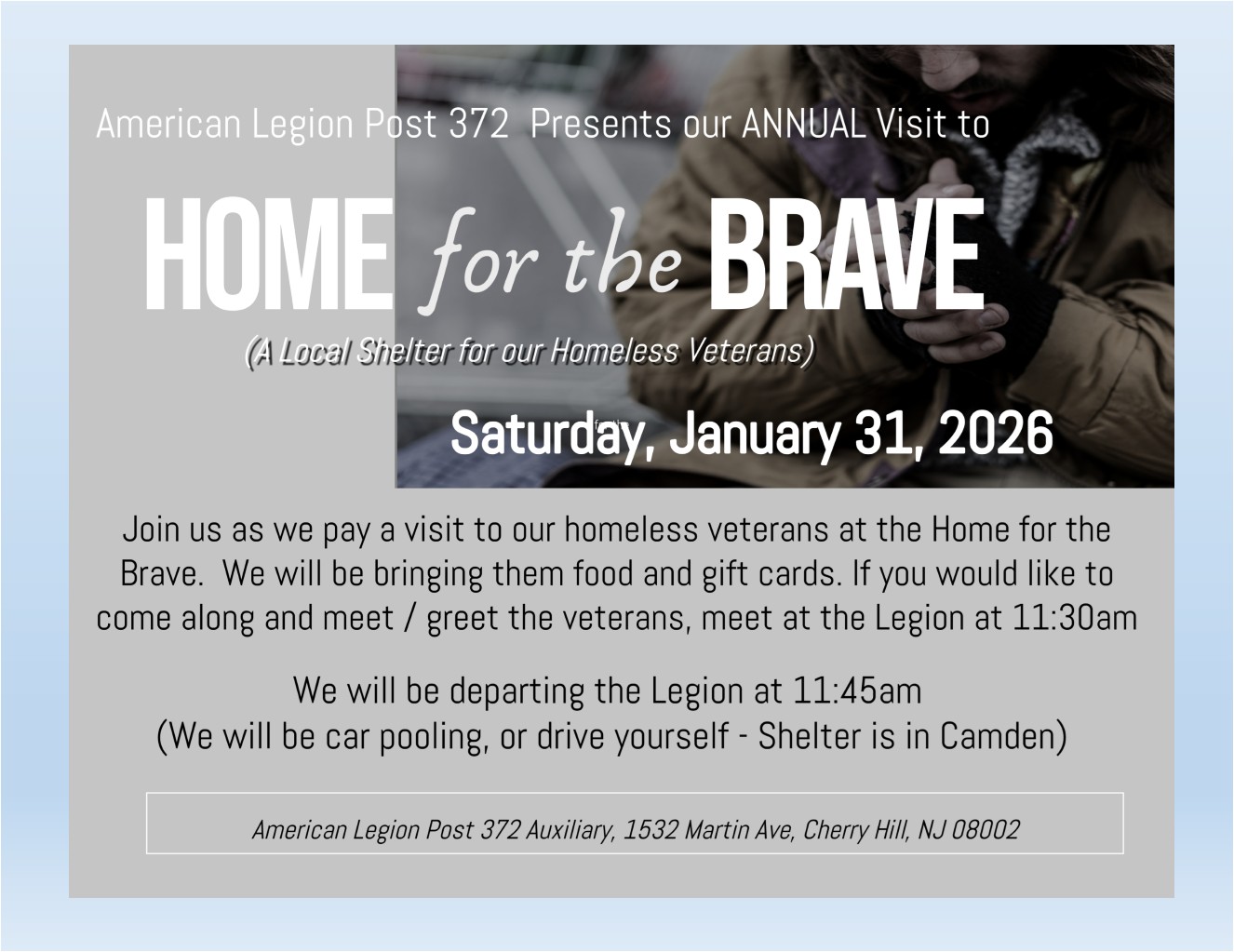 Join us as we pay a visit to our homeless veterans at the Home for the Brave. We will be bringing them food and gift cards. If you would like to come along and meet / greet the veterans, meet at the Legion at 11:30am. We will depart Legion at 11:45 (Car pool or drive yourself).