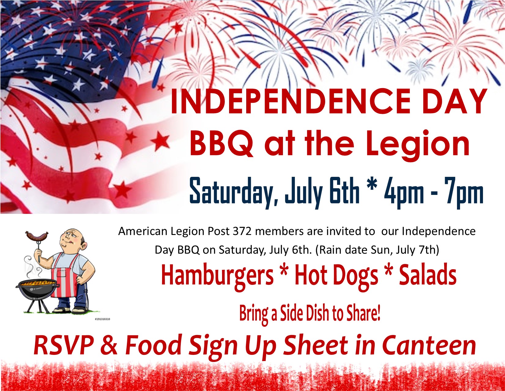 Independence Day BBQ at Legion American Legion Cherry Hill NJ Post 372 Posted on July 6, 2019 by June 25, 2019 When July 6, 2019 4:00 pm - 7:00 pm Add To Calendar Download ICS Google Calendar iCalendar Office 365 Outlook Live Where American Legion Post 372 1532 Martin Ave, Cherry Hill, NJ, 08002 American Legion Post 372 members are invited to our Independence Day BBQ on Saturday, July 6th 4-7pm. Rain Date Sunday, July 7th. Hamburgers, Dogs and Salad. Bring a side dish to share. RSVP and food sign up sheet in canteen.