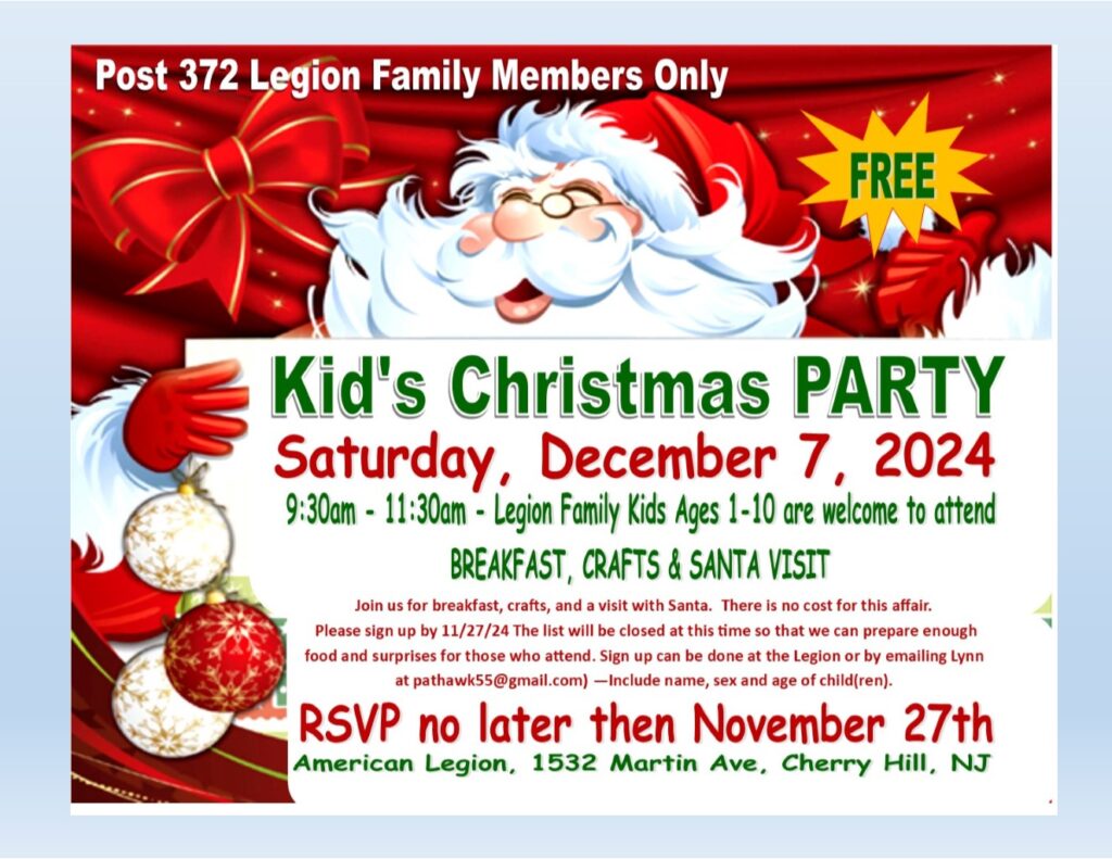 FOR AMERICAN LEGION POST 372 MEMBERS ONLY !!!!!!!!!!!!!!!Attention American Legion Post 372 members! Get ready for a cheerful morning at the Legion Family Children’s Christmas Party! On December 7th from 9:30 am to 11:30 am, children aged 1-10 are cordially invited to enjoy a delightful time filled with breakfast, crafts, and a special visit from Santa himself. This event is free of charge, but don’t forget to sign up before November 27th to secure your child’s spot. Whether you register at the Legion or via email with Pat at pathawk55@gmail.com, please include the name and age of your child(ren) to ensure we can prepare enough food and surprises for all attendees. Let’s make this holiday season magical for our little ones!