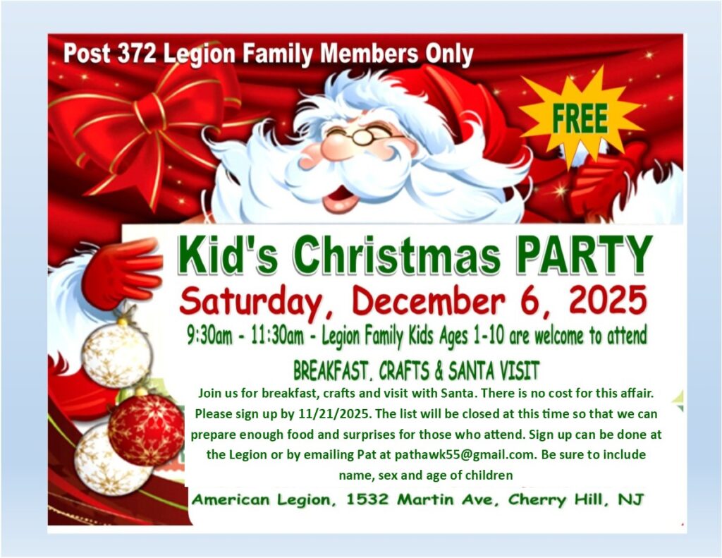 FOR AMERICAN LEGION POST 372 MEMBERS ONLY !!!!!!!!!!!!!!!Attention American Legion Post 372 members! Get ready for a cheerful morning at the Legion Family Children’s Christmas Party! On December 6th from 9:30 am to 11:30 am, children aged 1-10 are cordially invited to enjoy a delightful time filled with breakfast, crafts, and a special visit from Santa himself. This event is free of charge, but don’t forget to sign up before November 21st to secure your child’s spot. Whether you register at the Legion or via email with Pat at pathawk55@gmail.com, please include the name and age of your child(ren) to ensure we can prepare enough food and surprises for all attendees. Let’s make this holiday season magical for our little ones!