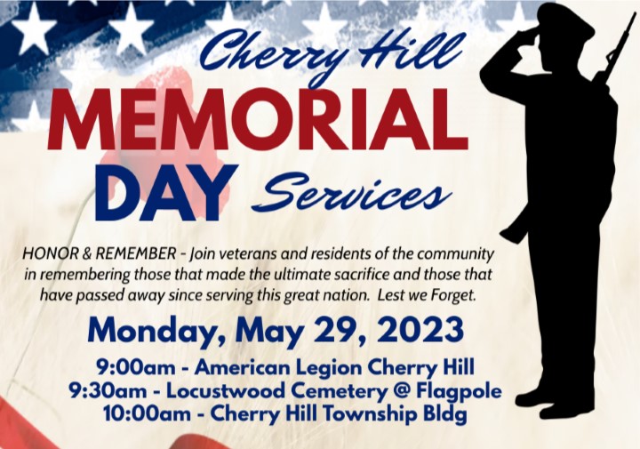 Join members of our Legion Post 372 and community to honor and remember our fallen on Monday, May 29, 2023. Services at American LEgion Post 372, 1532 Martin Ave, Cherry Hill, NJ at 9am, followed by services in front of the flagpole at Locustwood Cemetery, Rt 70, Cherry Hill, NJ and then services at Cherry Hill Township Municipal Bldg, 820 Mercer St, Cherry Hill, NJ at 10am