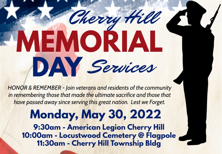 Memorial Day Services at American Legion Post 372, Locustwood and Township American Legion Cherry Hill NJ Post 372 Posted on May 30, 2022 by May 18, 2022 When May 30, 2022 9:30 am - 12:30 pm Add To Calendar Download ICS Google Calendar iCalendar Office 365 Outlook Live Event Type Events Join us for our Annual Memorial Day Services at American Legion Post 372 at 9:30am out front by the Flag Pole, followed by Service at Locustwood Cemetery and then Memorial Day Service at Cherry Hill Township Bldg at 11:30am.