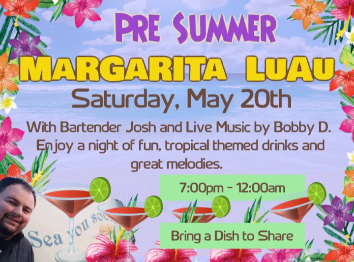 Pre Summer Margarita Luau American Legion Cherry Hill NJ Post 372 Posted on May 20, 2023 by May 10, 2023 When May 20, 2023 7:00 pm - 11:59 pm Add To Calendar Download ICS Google Calendar iCalendar Office 365 Outlook Live Where American Legion Post 372 1532 Martin Ave, Cherry Hill, NJ, 08002 Event Type Events Pre Summer Margarita Luau with bartender Josh and Live Music by Bobby D. Enjoy a night of fun, tropical themed drinks and great melodies. Bring a dish to share