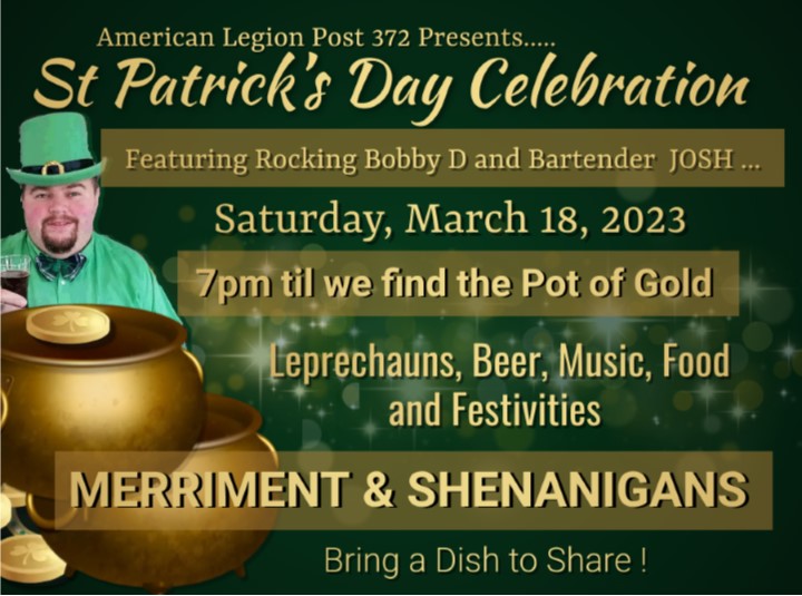 St Paddy’s Party at the Legion American Legion Cherry Hill NJ Post 372 Posted on March 18, 2023 by February 2, 2023 When March 18, 2023 7:00 pm Add To Calendar Download ICS Google Calendar iCalendar Office 365 Outlook Live Where American Legion Post 372 1532 Martin Ave, Cherry Hill, NJ, 08002 St Paddy’s Party at the American Legion Post 372 – Leprechauns, Beer, Music, Food and Festivities brought to you by bartender Josh and Rocking Bobby D ! Starts at 7pm and goes til we find the pot of Gold!
