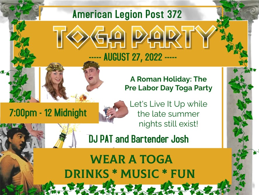 Toga Party – Canteen Scene American Legion Cherry Hill NJ Post 372 Posted on August 27, 2022 by July 27, 2022 When August 27, 2022 7:00 pm - 11:59 pm Add To Calendar Download ICS Google Calendar iCalendar Office 365 Outlook Live Where American Legion Post 372 1532 Martin Ave, Cherry Hill, NJ, 08002 Event Type Events A Roman Holiday: The Pre Labor Day Toga Party – Lets live it up while the late summer nights still exist. Bartender Josh and DJ Pat. Drinks, Music, Fun and of course TOGAs! 7pm-Midnight