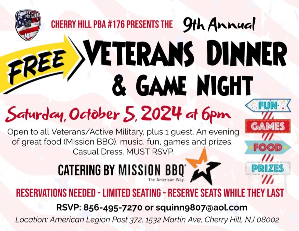 FULL – NO SEATS LEFT – Veterans Dinner & Game Night hosted by Cherry Hill PBA American Legion Cherry Hill NJ Post 372 Posted on October 5, 2024 by September 25, 2024 When October 5, 2024 6:00 pm - 8:30 pm Add To Calendar Download ICS Google Calendar iCalendar Office 365 Outlook Live Where American Legion Post 372 1532 Martin Ave, Cherry Hill, NJ, 08002 Full – NO SEATS LEFT –